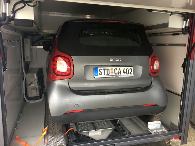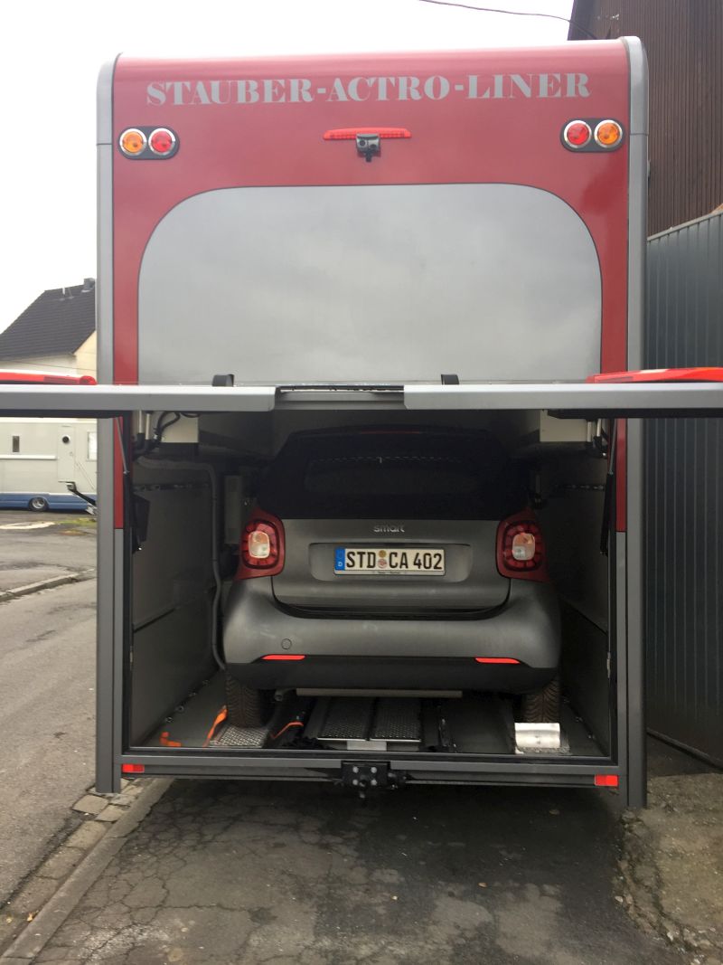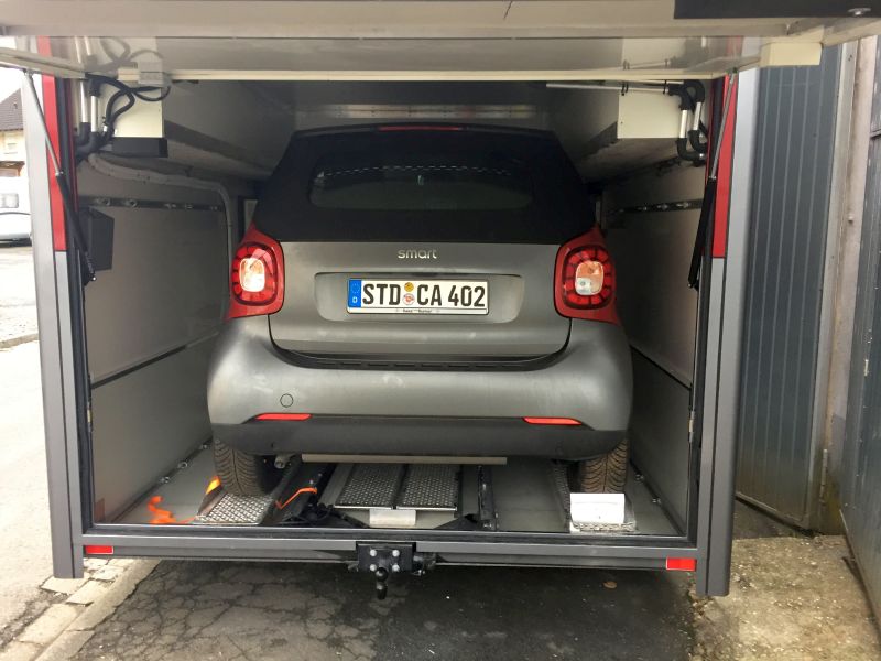 Heckgarage für Smart oder Zusatzwagen mit Stapelkisten. Toröffner mit Fernbedienung.