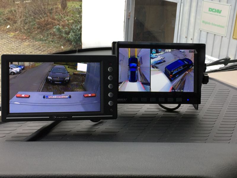 Links Shutter-Rückfahrkamera mit 2 Linsen und rechts 360° Rundumsicht.