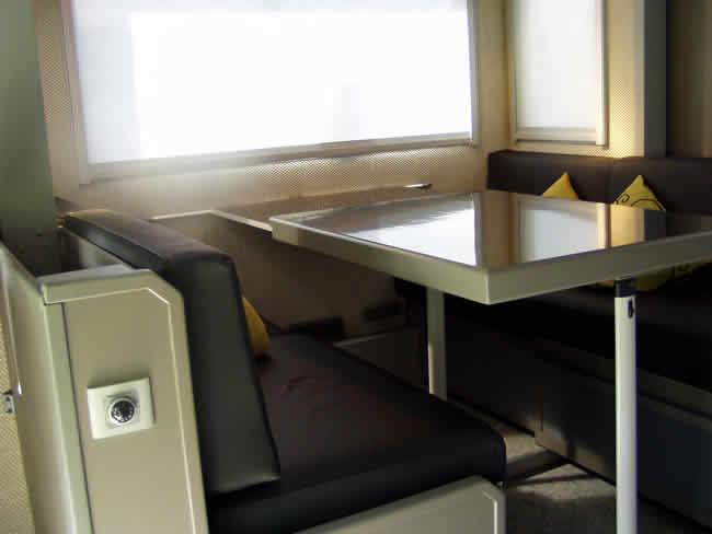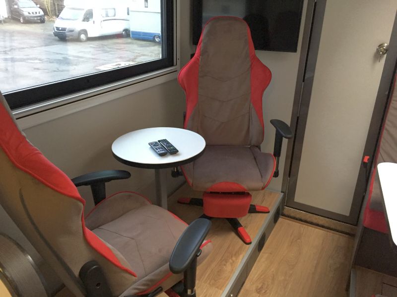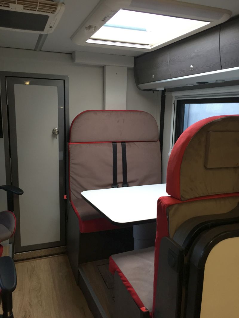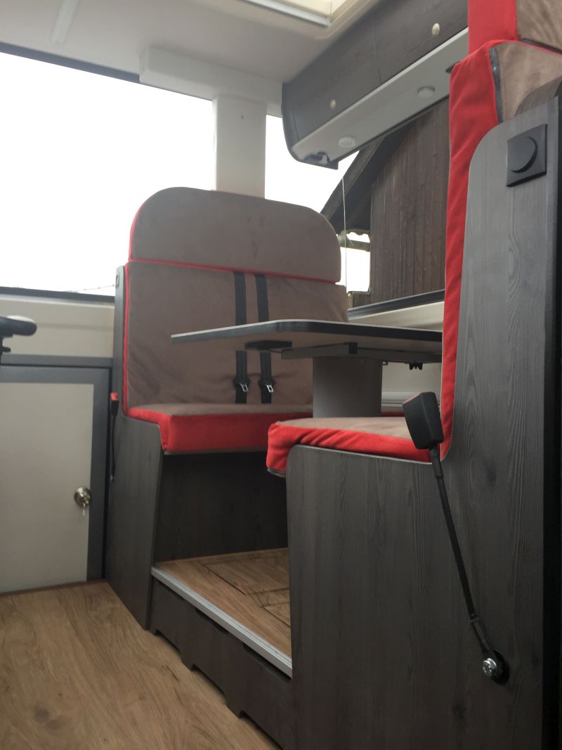 Dritter Sitz mit Staukasten drunter und aus der Fensterbank fährt der TV.