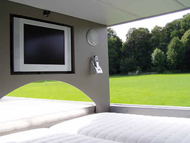 Am Boden der Wäscheeinwurf, oben der TV dann das Bett.