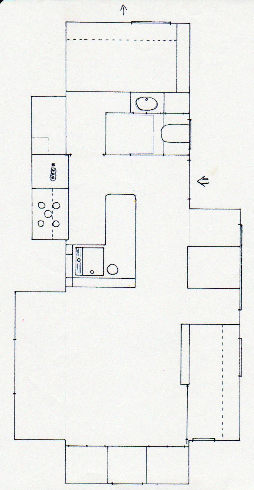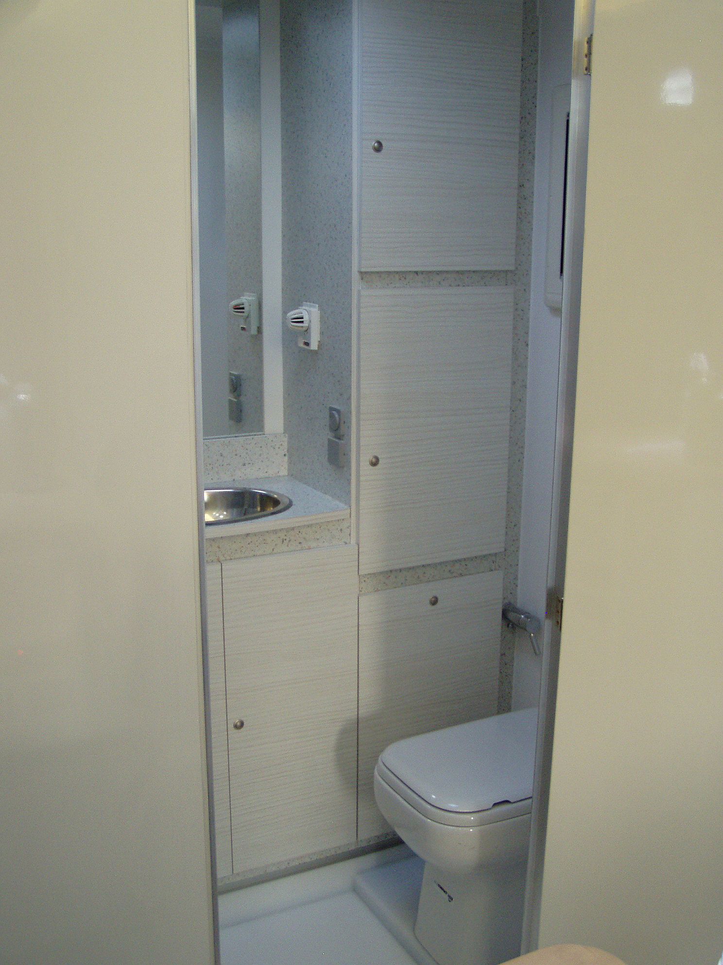 Waschbecken mit Unterschrank. Mit 2 Klappteilen lässt sich der Raum von der Toilette bis links rüber in eine große Dusche verwandeln.