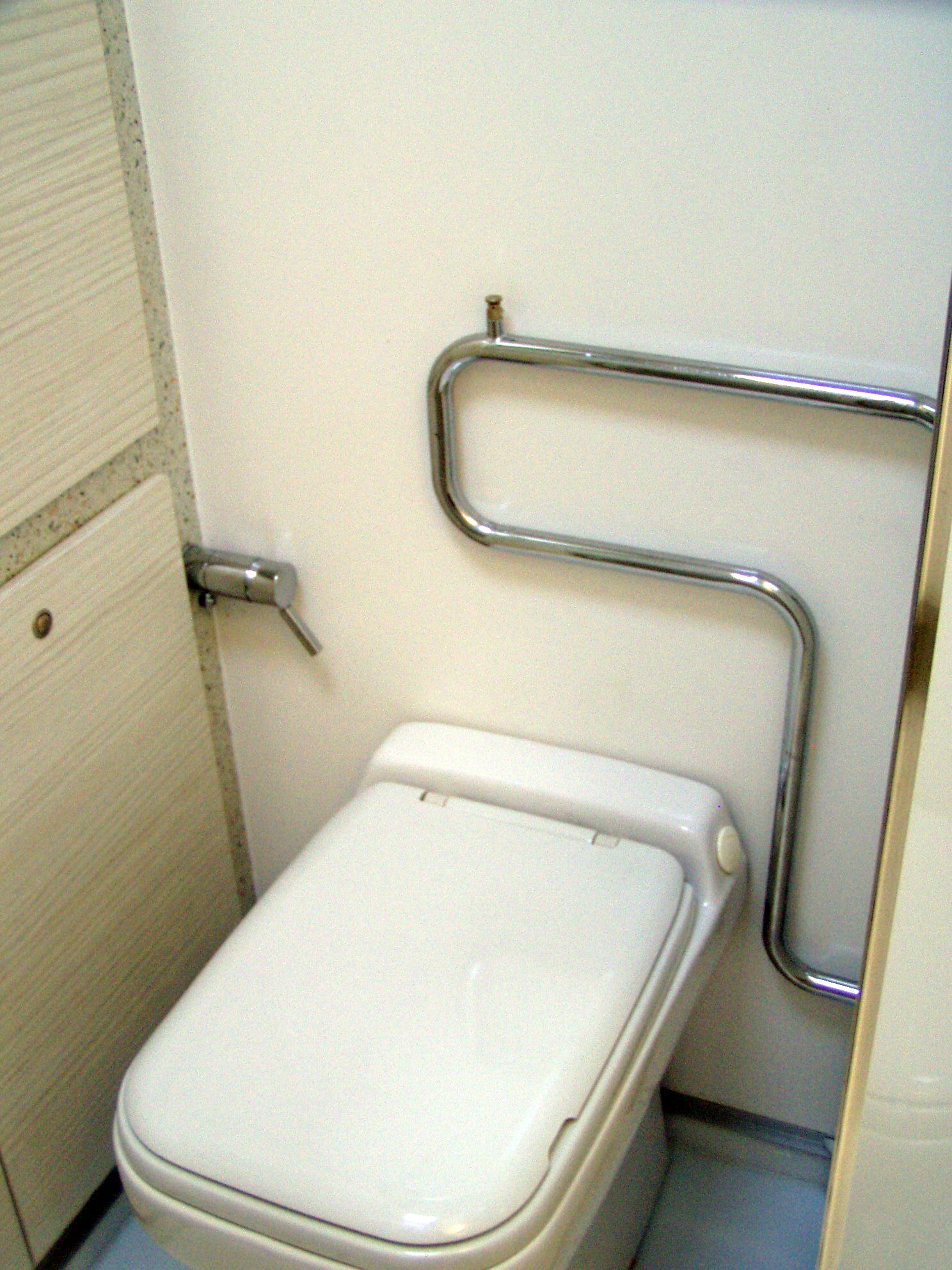 Festtoilette mit Fäkalientank im Doppelboden. Der Boden ist als komplette Wanne ausgebildet, bis rüber zur Dusche. Hier hat Wasser keine Chance.