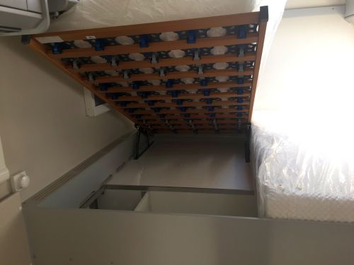 Hinten Leselampen, Steckdosen, seitlich Ablage mit Heizung und Froli unter der Matratze.