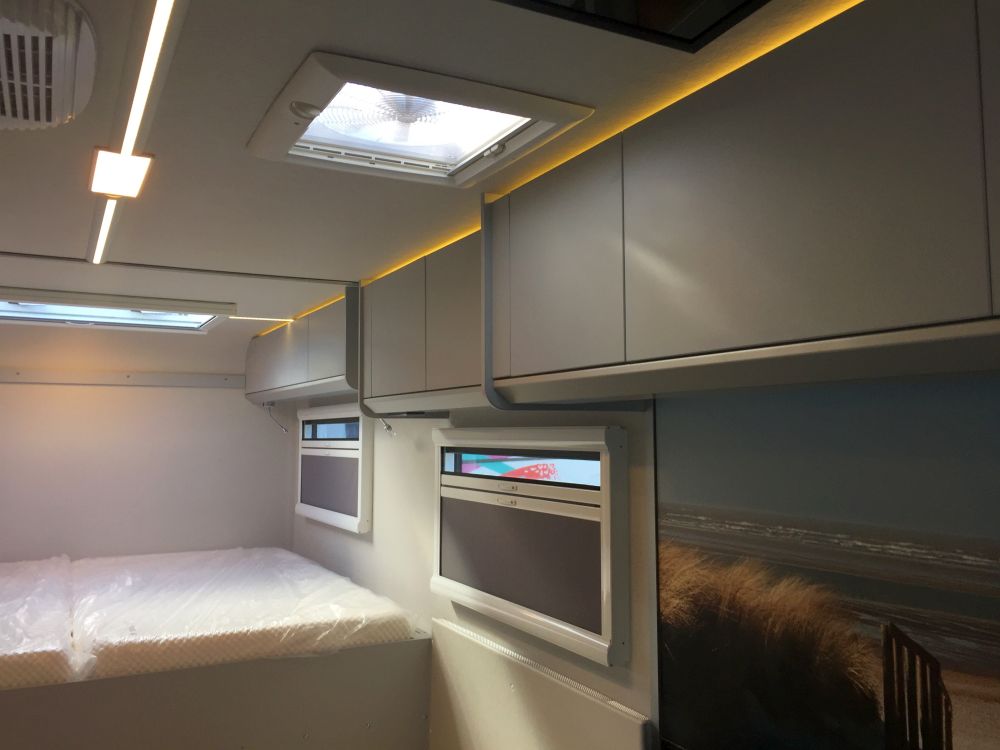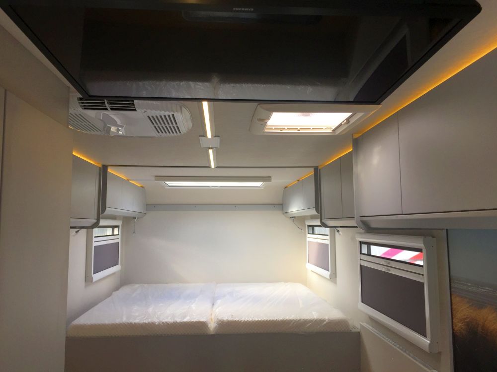 Das Dach fährt mit Motorantrieb in seine Postion und beherbergt ein Doppelbett 160 x 200 cm.