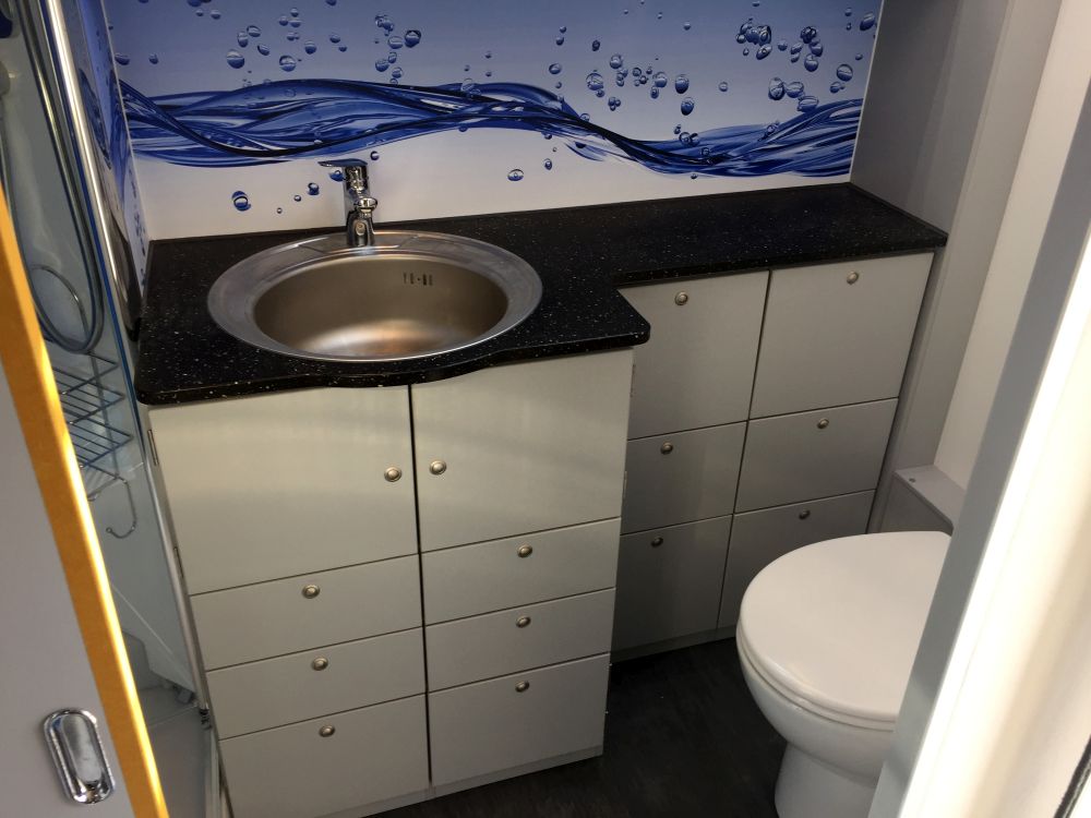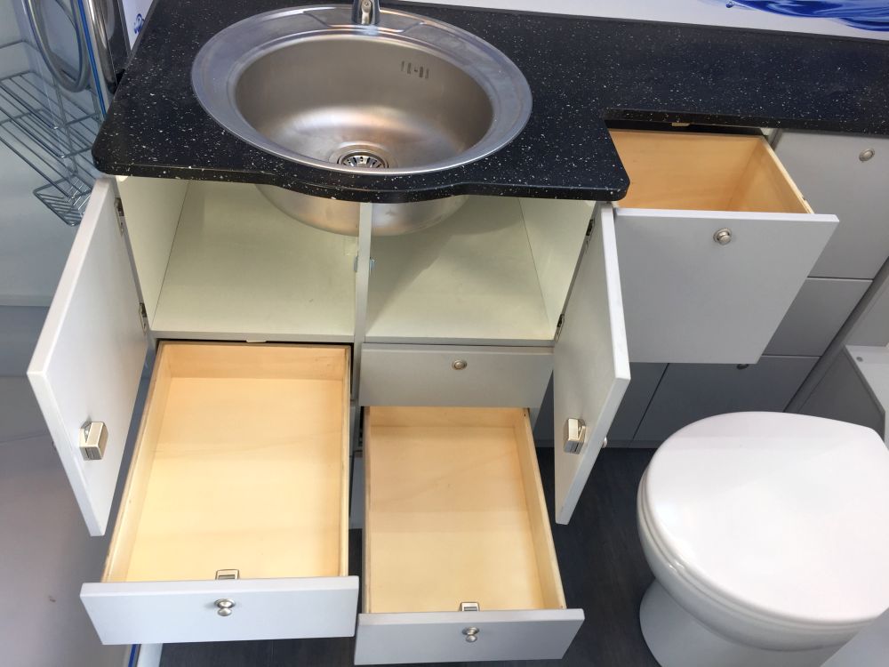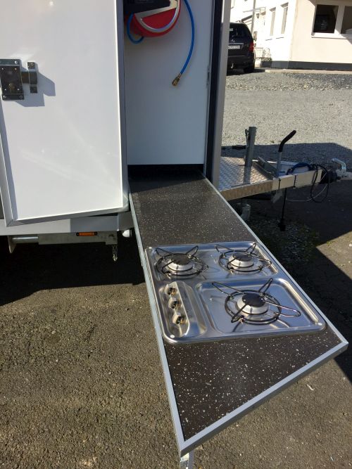 Vorne in der Schräge alles das was ein normaler Wohnwagen nicht hat.