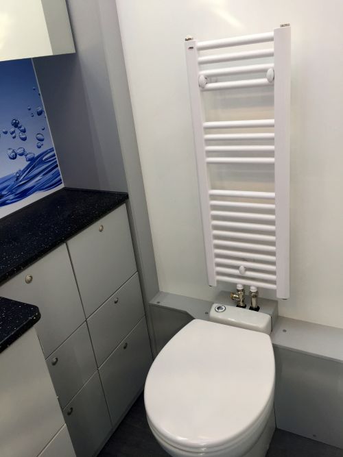 Die Toilette mit Fäkalien-Tank und Handtuchhalter darf nicht fehlen.